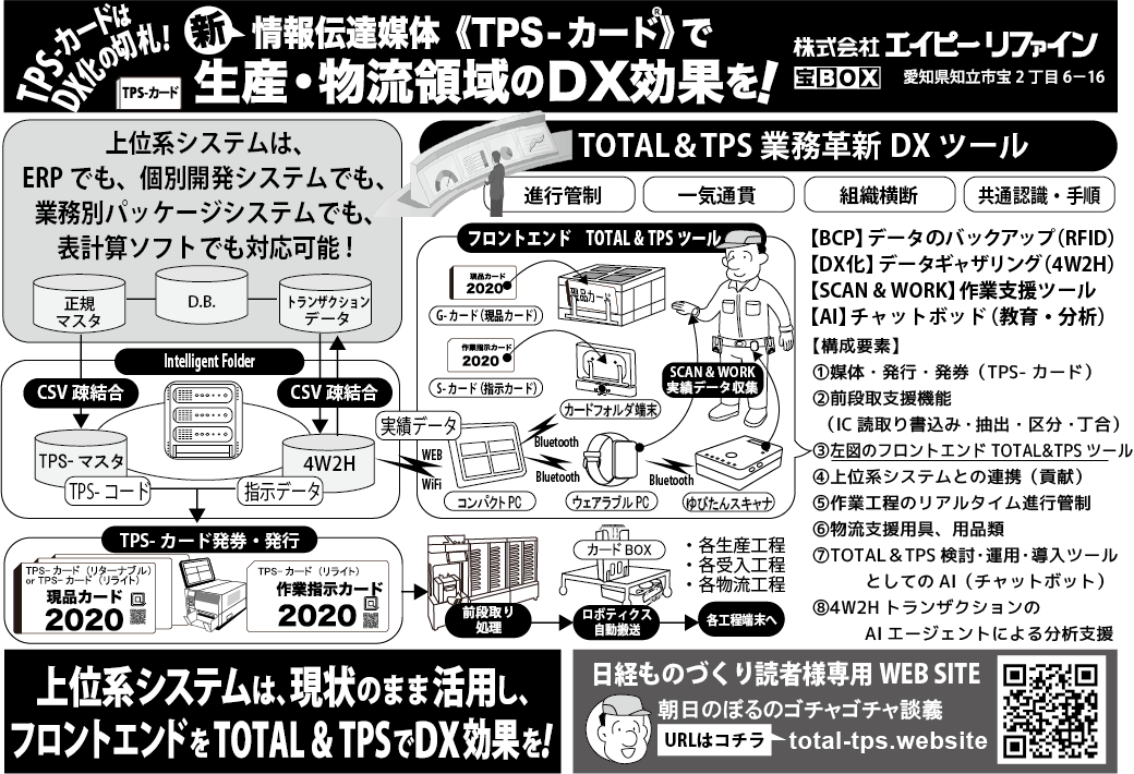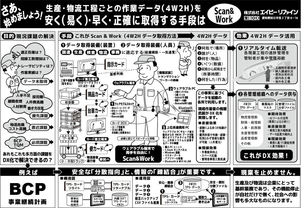 私たちが提唱する「TOTAL & TPS」の考え方は、全く違います。 作業と情報取得を一致させる「スキャン&ワーク」を大前提に設計しているのです。目・手・足を自由に保つために、タブレットやスマフォを現場に持ち込まない。